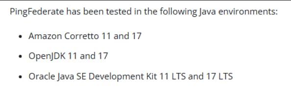 Lastly, the PingFederate server requires Java to be installed and the JAVA_HOME environment variable to be set on the machine. Supported versions and configuration steps can be found here: https://docs.pingidentity.com/pingfederate/latest/installing_and_uninstalling_pingfederate/pf_install_java.html